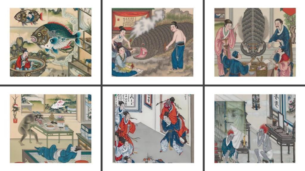 上面三个是和《CyberFish》的联动。下面三个,中间的叫《陆判》,讲的是大家喝醉了吹牛逼,主人公去陆判的庙里面把陆判的塑像背回来了。后来真正的陆判在半夜就来找他,随之发生了一系列离奇的故事,比如给他的老婆换了一个头之类的。最右下角就是《画皮》和《聊斋全图》绘本里的角色一个样子。这段文案是聊斋志异书里的原文,我要训练这个模型,其实我要先教AI,告诉AI这张图代表的是什么内容,那么我就要去翻《聊斋志异》这本书。所以为了做这件事情,我其实被迫把《聊斋志异》又翻了一遍,这在无形中其实是很系统化的做数据收集和研究的过程。