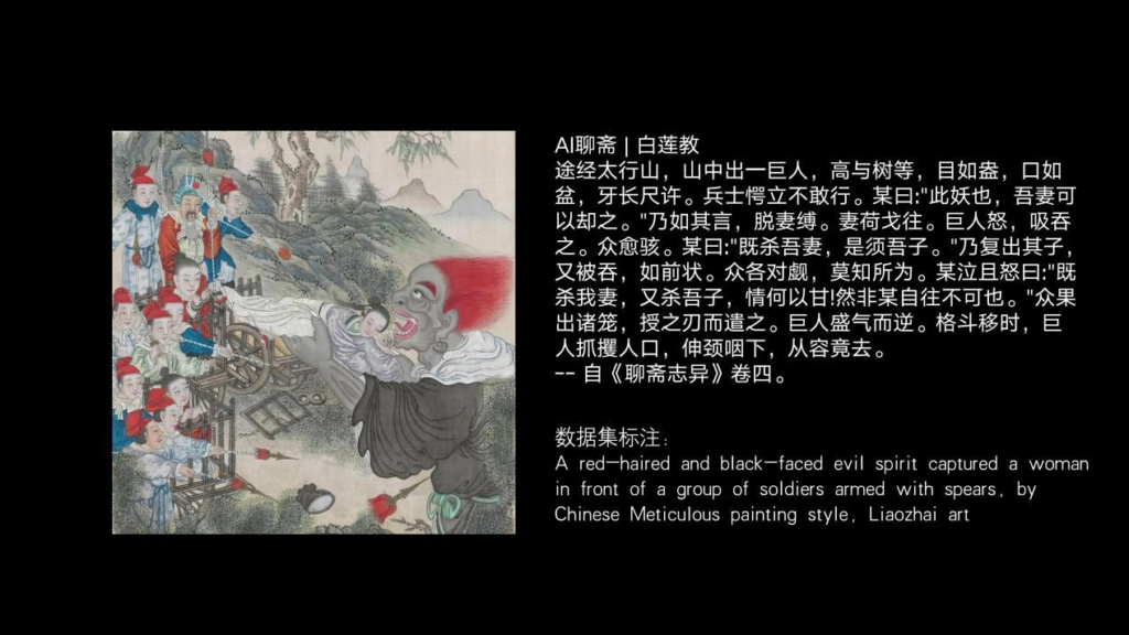有了模型在手,其实可以生成好多原来绘本里没有的关键帧或者分镜头。这集是《白莲教》,左边是原图,右边是《聊斋志异》原文,下边是我写的数据集标注。这个标注就是为了在训练过程中,告诉扩散模型这张图的用途,这张图里表有什么内容。经历这样一个过程的训练以后,就可以生成很多这一类的内容。这个故事其实很离奇,起因是主人公为了解救自己的妻儿,在被押送的过程中,突然出现了一个巨人把他们三个都吃掉了。但是巨人可能是到某一个地方会把他们三个再吐出来,也就是变相就把他们救走了。