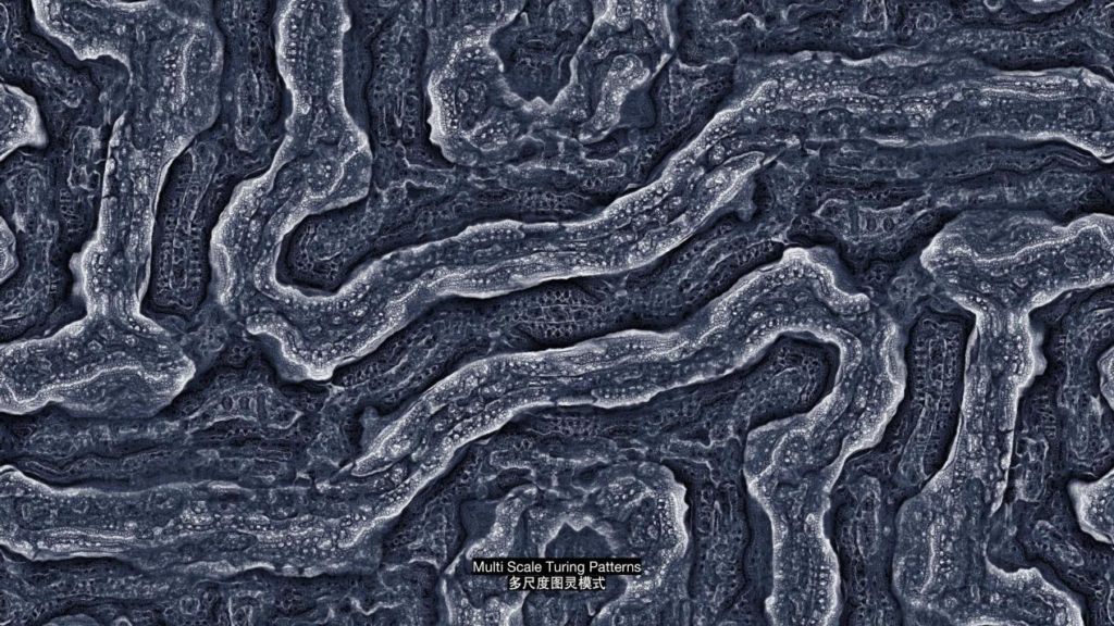 这个是三维的一种分形算法,制作这种作品的时候,只要通过算法和编程的方式把规则定好,通过艺术家给到的不同参数,计算机就会自动会帮我们生成这些作品。它跟直接拿笔画画还是不太一样的。拿笔画画你可能会从雕塑,或者其他的视角一步一步地去创造它。但是我们使用AI的时候,就需要先制定规则。像这种算法是多尺度图灵模式,它可能更多被用来生成模仿一些物体的形状,比如说地形的表面。像这个是跟电磁场有关的算法,这种数学算法本身很有一些美感,所以这些规则和算法通常被拿来做生成艺术。这是流体力学里的向量场算法,红线上的每一个点都有一个偏移量,把它连起来看就会形成一个向量场。基于这种算法,泰勒·霍鲍斯(Tyler Hobbs)创作了这件叫《Fidenza》的作品,在