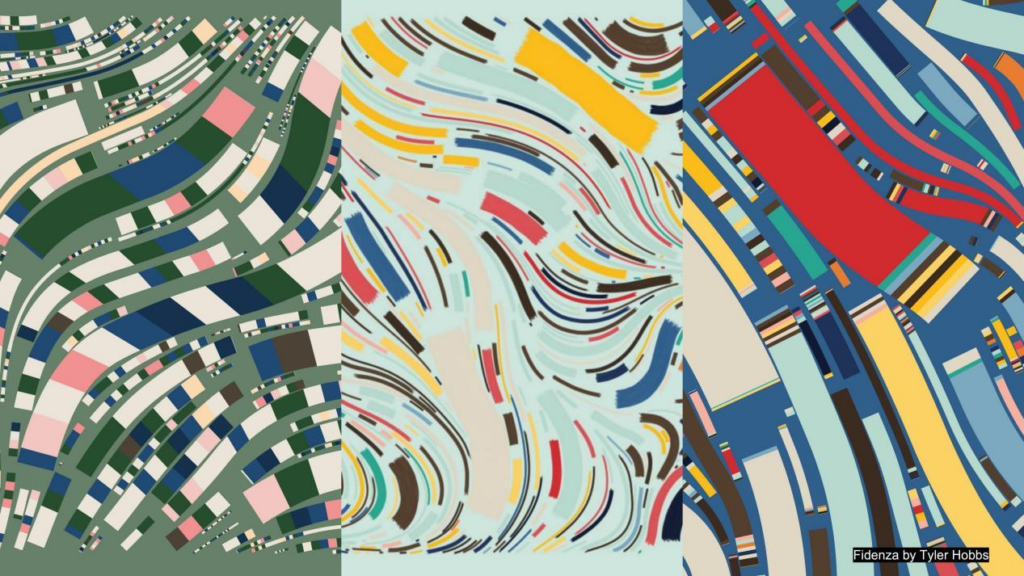 所以对于生成艺术的创作,艺术家其实是制定规则的人,然后由规则来产生最终的作品。这种规则通常是显性的规则,也就是说规则是可解释的。因为写代码的艺术家是规则的设计者,这种规则或者协议决定的是能发生什么,而不是决定最终的作品长什么样子,艺术家的关键是制定这个系统。作者性在这里其实也是很直观的。艺术家通过写代码得到一个program,这个程序包含了一套规则系统,当这个规则跑起来后就会得到最终的画面。