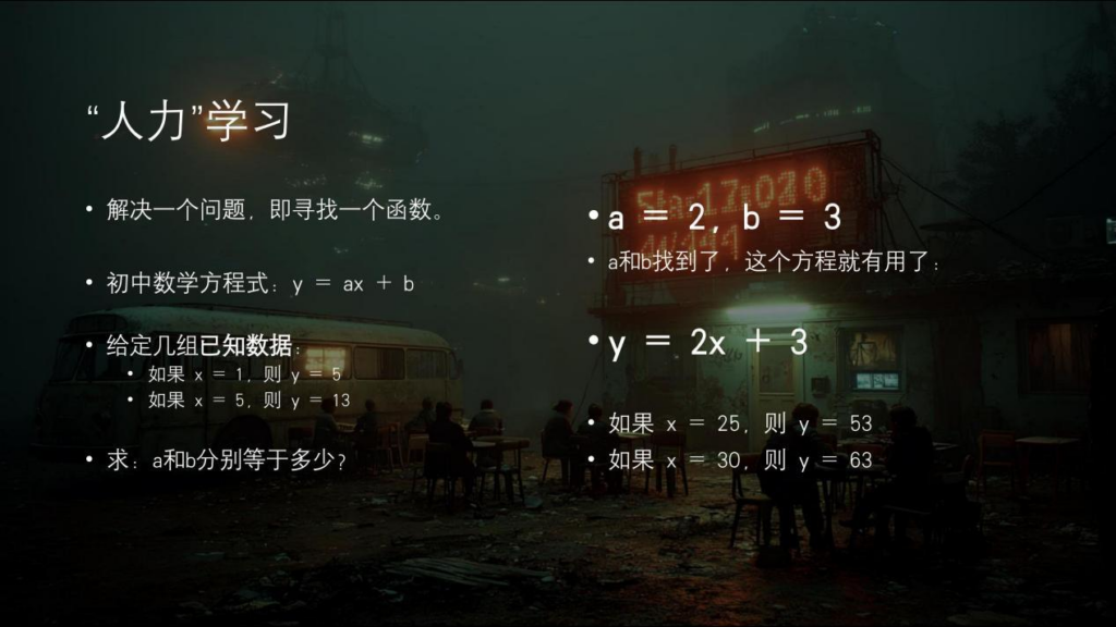 我们出一道稍微有点难度的初中数学方程式——“y=ax+b”。如果我们给定了几组已知的数据,比如说“x=1”的时候“y=5”,“x=5”的时候“y=13”,这些是我们已知的数据,然后我们需要求它的参数a和b分别等于多少,我们有了一个方程式“y=ax+b”,但是因为a和b这两个参数是不知道的,所以你没办法用这个方程去解决某一个问题。