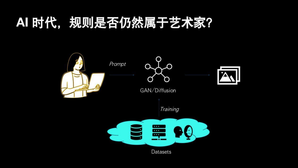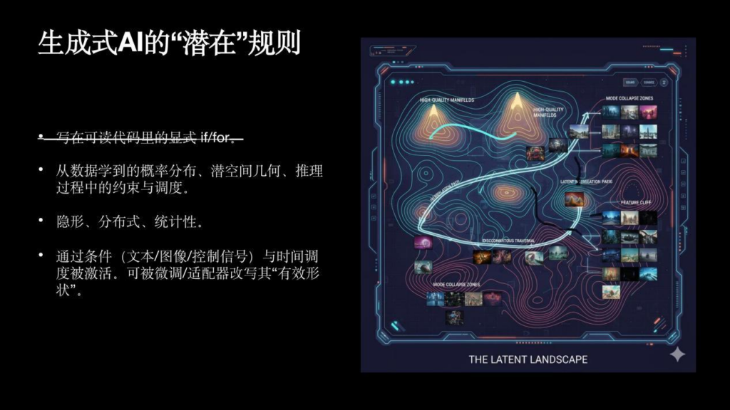 刚才我铺垫了那么多,但是到了AI时代,大家平时创作的方法变成了写提示词,然后由一个AI模型和这些提示词配合,最终生成内容。那么这时我们就有一个经常被讨论的话题:规则是否仍然属于艺术家?或者说所谓的AI艺术家是否存在?你拿AI去创作的时候,不管是写东西还是画东西,这个是你写的还是AI做的?但其实在AI里也是有规则的,但它的规则是潜在的。不像之前的算法生成艺术,我们直接在可读的代码里去写“if”等条件判断。对于AI,其实关键是机器自己学习规则,而不是艺术家去写这些显性的规则。AI从我们前面说的“a=2,b=3”这类数据集中,或者那些鱼的数据集,以及《聊斋全图》数据集里自己学习概率分布,在潜空间里面得到这种几何规律之后,进行推理约束和调度。但归根结底规则仍然存在。