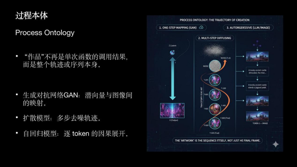 那么我们作为艺术家如何去把控这种规则,或者说介入到这种规则里?可能我们刚开始用AI创作的时候会觉得比较无助,因为你能做的事情好像只是写提示词,剩下的那些AI都帮你完成了。但实际上这里边有很多意思不明确的词,会提示你它的作用。比如最左边的是生成式AI,它是有一个潜空间和插值动画,中间是扩散模型,它是从一个噪声值开始一点点扩散,最右边的是现在比较新的自回归模型。自回归模型它更像是以时间的维度去关联前一帧和后一帧,所以在模型内部就具备了因果的理解力。之前的模型生成一次就是一张图,哪怕生成视频得到的也是多张图的序列帧,它的前后内容在逻辑上其实是没关系的。但是到了现在,它能根据之前的内容来推测后面要发生的事情,其实就有了因果。这个时候的作品就是一个完整的轨迹与序列。那么在潜空间里通过这种插值,你其实就可以做一些创作而不只是写提示词。在自回归模型甚至是在扩散模型里,随着生成过程的展开,其实每一步我们都可以修改很多参数。尤其当我们作为一个算法工程师或者算法艺术家时,即使给到AI同一个提示词,也就是说给它同样世界观的时候,我们还是能做出很多内容,这其实就是一个人机交互的动态过程。在我们反复尝试使用模型后会得到一个谱系,在这个谱系里通过不断地反馈,通过这些反馈去调整输入的关键词,就会最终生成闭环的作品。