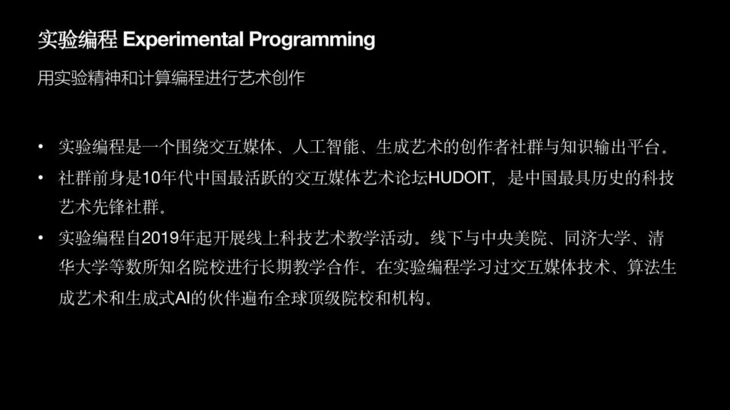 这是关于网络社会以及新媒体艺术的一些“老黄历”,我的社群“实验编程”是一个创作者社群以及知识输出平台。可能从08、09年开始,有一个比较活跃的交互媒体论坛“who do it”,这是它的前身。其实最早的群体活跃在豆瓣小组,后来做了论坛,然后就一直发展到现在。大概是这样一个过程。这个也是蓬岸一直在跟我交流的一些东西:这群人的过去和现在,以及他们所代表的一种创作生态和技术,在AI前和AI后产生了哪些创作感受。谢谢大家!