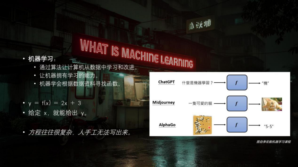 我们再举几个例子,比如ChatGPT这种大语言模型。当你问ChatGPT:“什么是机器学习?”,那么它会先回答一个字“机”,然后是“器”,这样一个字一个字地输出。我们在去年用ChatGPT的时候,你会发现他吐字的时候很慢。因为它其实是先把“什么是机器学习”作为输入x,得到的输出是“机”这一个字,也就是“y=机”,然后再把这个“机”加到“什么是机器学习?”上。“机”作为一句话,再丢回给这个函数。得到的下一个输出是“器”,然后再把“机器”加到前面的问题里,就这样一点一点地往后吐字。