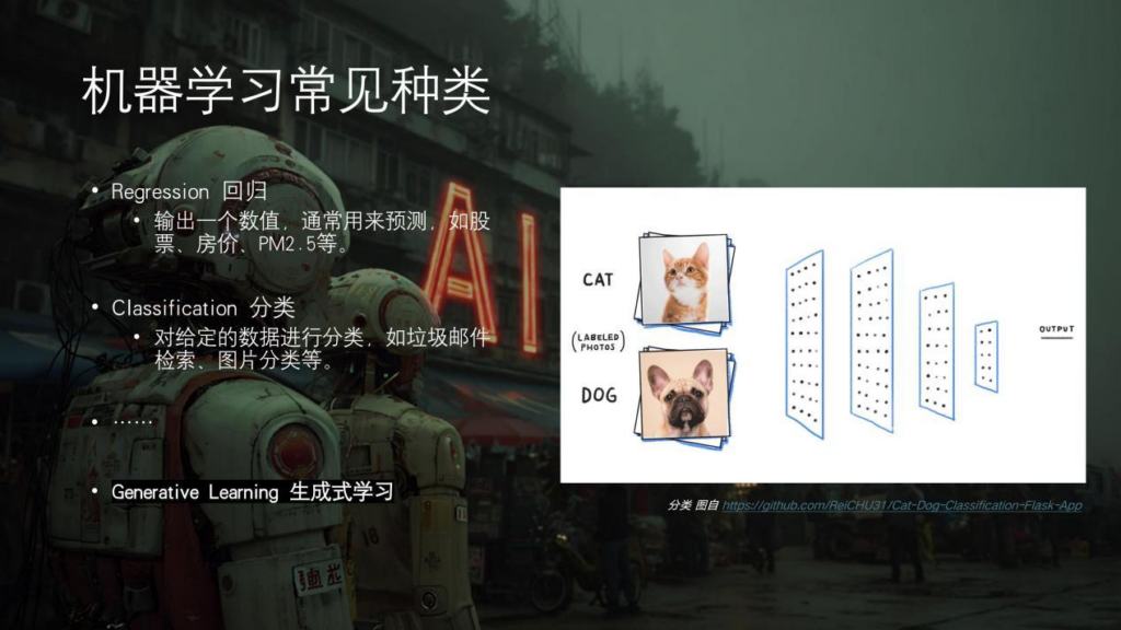 Midjourney这种图像生成AI同此道理,可能它的x是一只可爱的猫,它的y就是一张图。在早年间,阿尔法狗(AlphaGo)围棋也是这样。它的x输入是当前围棋局势的这张图,它的输出就是落子的位置。像这种方程人类其实很难写出来,但是通过机器学习让机器自己处理大量数据之后,它就可以写出来。机器学习的应用有一些常见的种类,比如回归类,通常是应用于预测,包括预测天气以及Pm2.5等等;还有给事物分类,比如说画面里有猫有狗的两组照片,它会自动地帮你把猫和狗做区分。其实我们现在每天都在用AI,所以大家会觉得这是自然而然的事,实际上这都需要通过训练来学习。如果你在训练AI的时候给它很多猫的照片,并告诉它这是狗,那么等它学习之后,你再给它一张新的猫的照片,它就会告诉你这是狗。这其实和小孩一张白纸的状态一样,你教他什么,让他学什么,怎样去引导他,他最后就会学成相应的样子。还有一类是我们现在用的最多的生成式学习(Generative Learning),对应到我们今天的主题。我们日常生活中会用生成式AI去生成文字、生成图片,生成视频,生成各种多模态的内容,其实像大语言模型、图像、音乐等等绝大部分,都属于生成式AI的范畴。