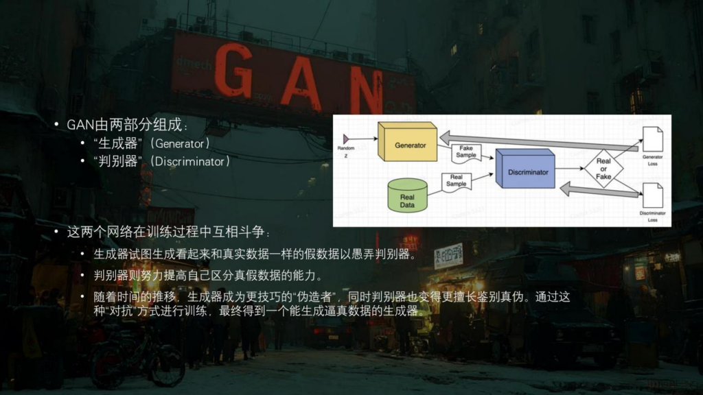 我首先会讨论一下在前几年比较流行的一类生成模型——生成对抗网络(StyleGAN)。这个词可能在一些论文里会出现比较多,因为现在大家日常用的是扩散模型(Diffusion Model)以及扩散模型的一些变体,但是“扩散模型”这个词写在文章里感觉就不是那么亮眼,而“生成对抗网络”这个词写出来就很好看,尽管它的名字是很技术性的。那我们来看一下什么是生成对抗网络。它包含两部分:生成器(Generator)和判别器(Discriminator)。生成器的功能就是不断地生成一张图,然后判别器就会来分辨这张图是AI生成的假图,还是一张人类真实数据里的照片。当判别器做出正确判断以后,生成器会接着进化,直到生成的图或者结果非常接近真实的数据,让判别器判别不出来的时候。这时二者间所谓的对抗或者说博弈就到达了一个平衡点,那么这个模型就已经被训练为比较完善的状态,这是生成对抗网络的一个特点。