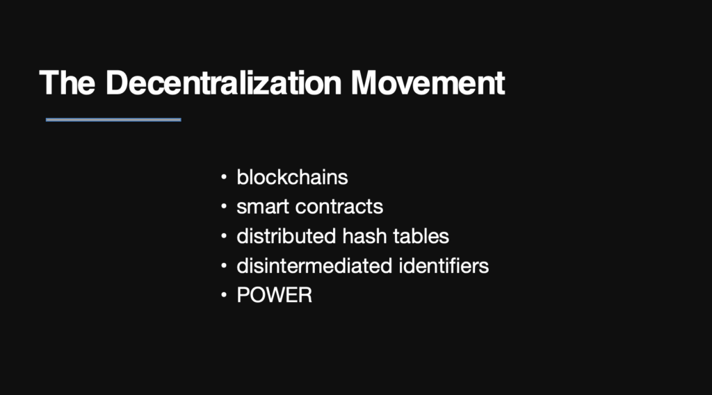 所谓去“中心化运动”( Decentralization Movement),有些人称之为D-Web,是一群散布在世界各地的松散集合体。这个群体致力于构建去中心化、分布式或联邦式的硬件和软件系统,使用区块链、智能合约、分布式哈希表(distributed hash tables)等工具以及去中心化标识符(decentralized identifiers)。它与Web3有着密切的联系,但根据我的经验,和不同的人交流时必须小心用词。如果你把D-Web的人称作D-Person,他们可不太高兴。