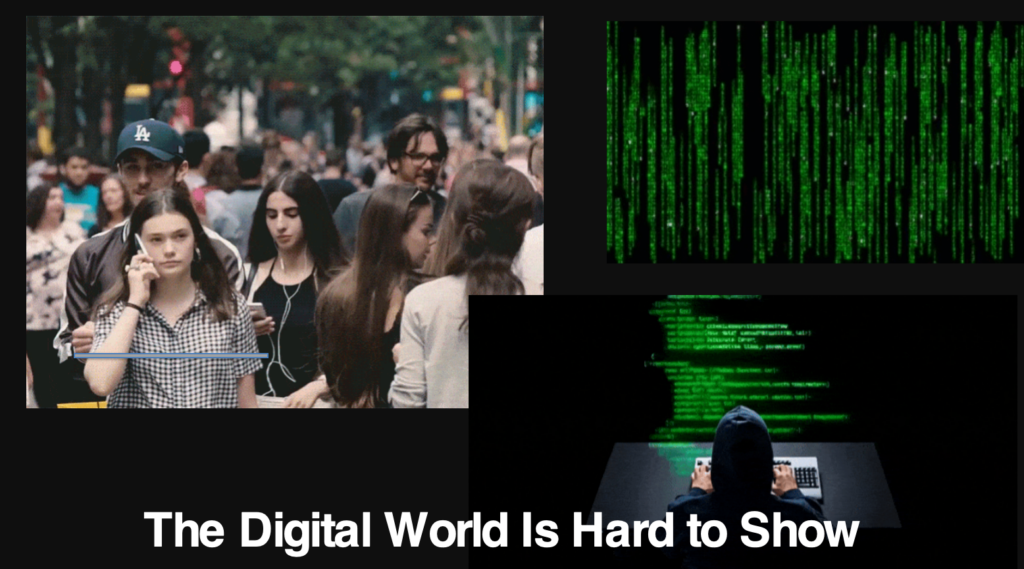 诸位可能之前见过这种影片。一部电影里,某个专家告诉你该怎么想,画面却充斥着黑客在普通键盘上敲字的碎片影像,或无名人群头顶漂浮着弹窗方块。说不定还有《黑客帝国》式的数字雨倾泻而下,音轨里穿插着一连串的警句。采用这种方式是有原因的,数字世界很难表现,所有的活动都发生在黑匣子里,或者在抽象的思想空间里。我也面临着这个问题:从集中的系统架构到去中心化架构的转变,本质上不应该有任何可见的形态。我早意识到,绝不会有盏大红警示灯突然变绿——“瞧!互联网去中心化了!”一个点对点网络的运行效果本应该和中心化的网络运作方式一样,至多可能稍微慢一点。那么,我到底能展示什么呢?