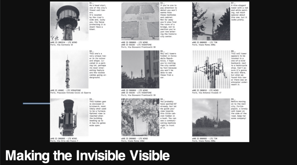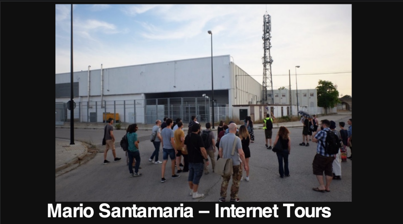 我原本打算给大家展示一些纪录片片段,但我不想剧透,所以你们只能看到静态图片。这部纪录片的主线其实是我自己,更准确地说,是艺术家马里奥·桑塔马利亚(Mario Santamaría)的作品。马里奥·桑塔马利亚是一位跨学科艺术家,专注于通信技术对世界的影响。他最受欢迎的项目之一是“互联网之旅”(Internet Tours),他带人们徒步穿越城市,指出那些看不见或隐藏的电缆、线路和天线。Mario利用这个项目来讨论这些技术在我们生活中的作用,比如一个伪装成真树的5G天线塔的出现,可能正象征着某个正在快速“士绅化”(gentrifying)2的社区。