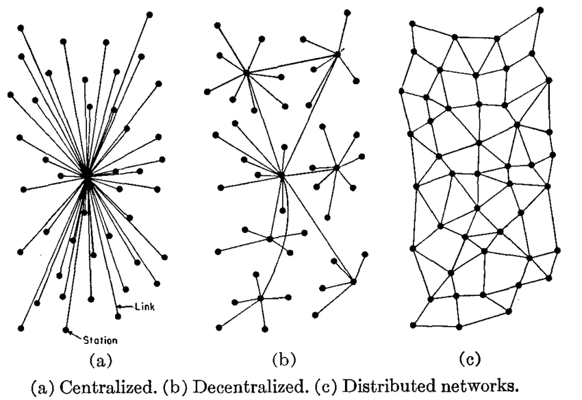 故事始于冷战。一位名叫保罗·巴兰(Paul Baran)的美国工程师当时在兰德公司(RAND Corporation)工作,一家主要为美国国防部(我猜现在应该叫美国战争部)设计战略方案的军事智库。巴兰受命设计一种能扛住核打击的通信网络,于是构想出去中心化与分布式架构:一种能绕过破坏、抵御攻击、在中断中继续运行的网络。也许你见过他那张著名的图,我几乎在所有地方都能看到它。人们把那张图画在餐巾纸上,贴在白板上,甚至装裱成海报挂在墙上。巴兰的设计不仅解决了一个技术问题,也解决了一个政治问题。他构思了一种没有单一失效点系统,而这也意味着要建立一个没有单一主权的网络。对惯于使用自上而下、层级森严的集中式指挥控制基础设施的军方而言,这无疑是革命性的。