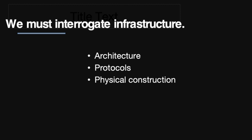 制作这部纪录片的过程对我来说是一段复杂的旅程,它也让我收获了许多经验,但今天我想与大家分享其中最重要的一点:我们必须追问基础设施,因为它是理解我们自身、我们的价值观和我们的政治承诺的一种途径。这是我在深入了解纪录片中人物的过程中学到的。当我跟随他们构建去中心化技术时,我看到他们为基础设施的设计呕心沥血——他们翻阅网络系统的架构、协议以及物理构建。