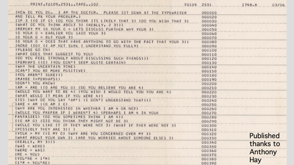 “DOCTOR”是一个专门模仿心理治疗师的脚本,当有人输入“男人都是一个样”时,它会回复:“在何等程度上一个样?”“他们总是为各式各样的事情来烦我们”,“你能想到一个具体的例子吗?” “你能想到一个具体的例子吗?”“我的男友让我来这儿”“是你男友让你来这儿的啊”“他说,我在大部分时间里都很沮丧”“听说你情绪低落,我很难过。”“这是真的,我一点也不开心”“你觉得来到这儿能让你开心点吗?”