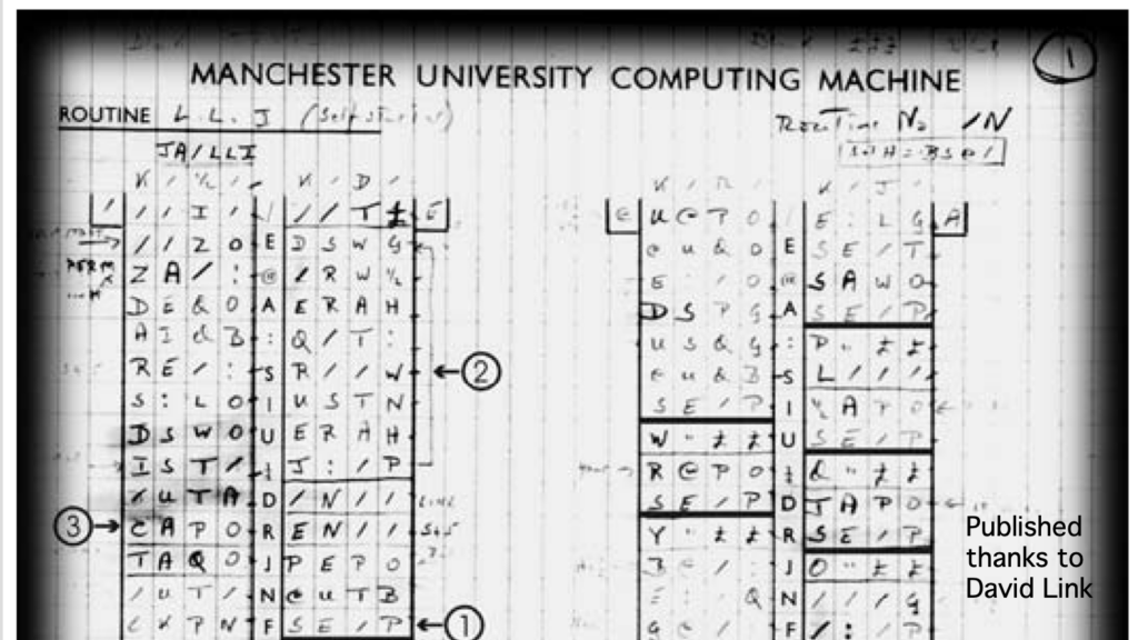 在这份手稿上,斯特雷奇写下了程序的机器代码。他手工书写了代码,并通过编码打孔的方式使其能在计算机上运行。这些机器代码是专门为曼彻斯特Mark Ⅰ计算机(类似于费兰蒂MarkⅠ)编写的。当时,斯特雷奇使用的是机器码,但不久之后,世界各地的人们就将研发出汇编语言,更便捷的替代方案。只不过它的级别同样很低,同样只能针对特定机器来使用。