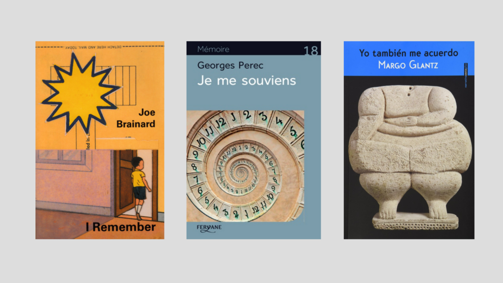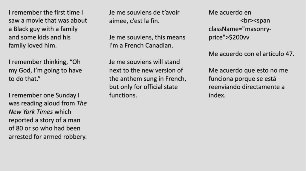 最后,我会读一小段由Mistral-7B生成的诗:《回忆录》(Memoir)。这是我为数不多的、用具有纯文本补全模型的LLM进行的创作。屏幕上呈现了乔·布雷纳德(Joe Braindard)的作品《我记得》(I remember),一本实验性回忆录,或者说是诗集。在未读过原版,仅知晓概念的情况下,法国人乔治·佩雷克(Georges Perec)创作了它的法语版本。另一本书是玛尔戈·格兰茨(Margo glantz)的西语著作《我也记得》(Yo también me acuerdo)。吸引我的是,当我们给Mistral-7B一个非常简单的提示词——“我记得”时,它会用英文输出一个有关黑人的故事:“我记得自己看过的第一部电影,故事讲的是一个黑人,有家室和孩子,全家人都很爱他。”这样的输出结果确实让人惊讶。