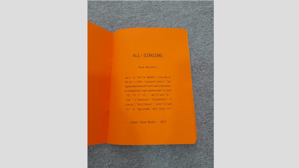 好的,下一个项目是用高级编程语言Perl写成的,我在加拿大的班夫镇创作了这段程序,之后,葡萄牙莱里亚市的一家出版社出版了它。这个作品名字叫《所有的歌唱》(All-Singing),我会将它念给大家听。当我朗诵时,请传译人员稍微休息一下,我将表演这本书的首页和最后一页,它们有着“声音诗”的特征。