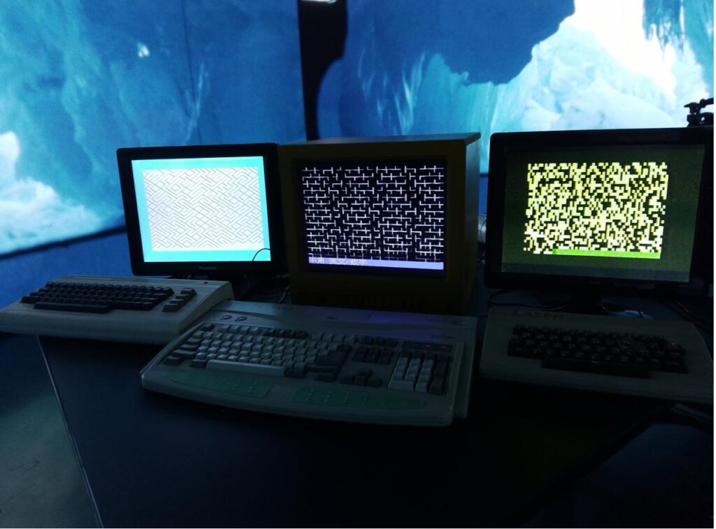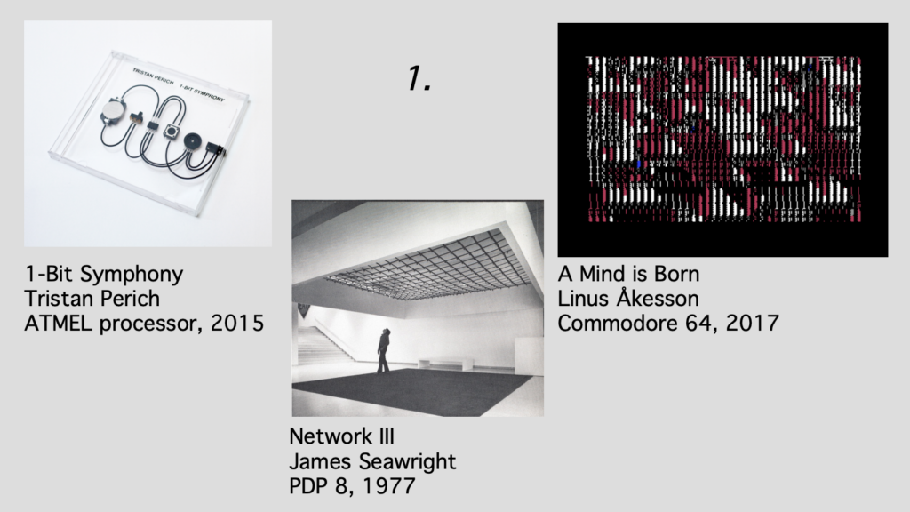 值得注意的是,汇编语言编程不仅被用于早期艺术项目,近十年来的当代艺术创作里仍有它的身影。在PDP-8计算机上(各位可以在跨媒体艺术节展映影片中看到它的身影),詹姆斯·西沃特(James Seawright)于1977年创作了《网络Ⅲ》(Network Ⅲ),它能与走到作品下的观众产生交互。这个项目是用汇编语言创作的。特里斯坦·佩里奇(Tristan Perich)的《1比特交响曲》(1-Bit Symphony)是一件装在CD盒里的声音作品,但其本质是物理计算装置。因此,每次你听到的声音和音乐都是实时生成的,他用亲自编码的Atmel处理器实现了这一效果。然后是一件2017年演示场景中的惊艳之作,林纳斯·阿克森(Linus Akesson)的作品《思维之诞生》(A Mind is Born),这是一个在康懋达 64电脑上运行的 256字节程序,有着声音和图形。