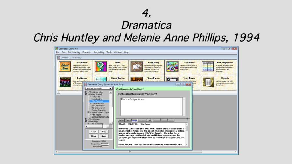 我还没有亲自用过Dramatica,不过这个程序是1994年由亨特利(Chris Huntley)和菲利普斯(Melanie Anne Phillips)开发、很像photoshop的应用,作者们能利用它,使故事的不同方面得以开展。可以看到,它有一个图形用户界面,也有写作和发展情节的性能。