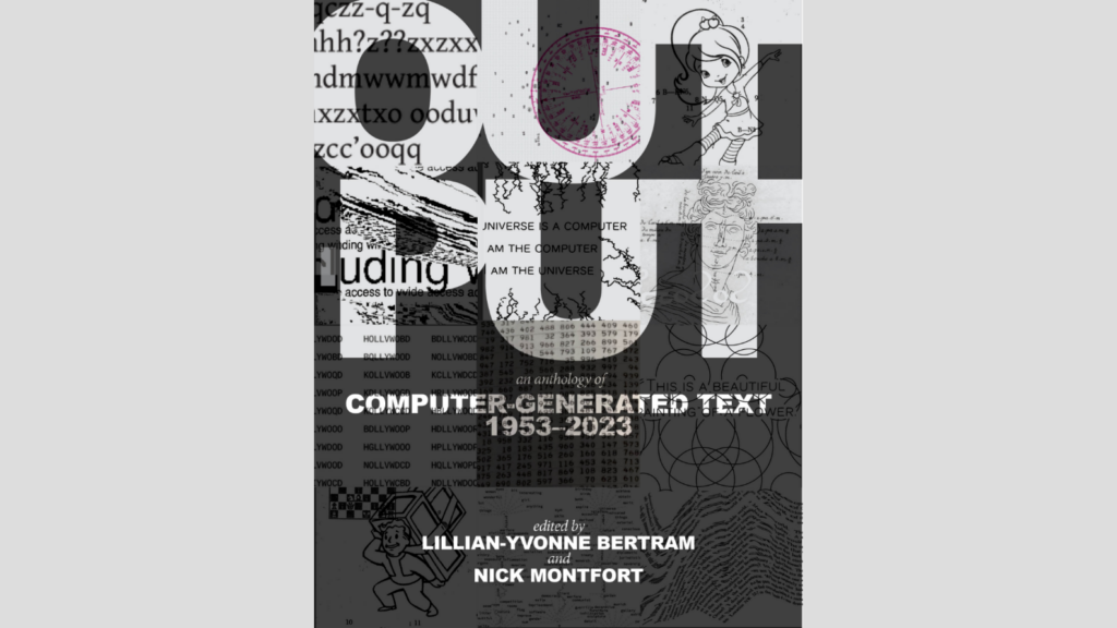 莉莲·伊冯·伯特伦和我共同编纂了这本书:《输出:1953-2023年电脑生成文本作品选》(Output:an anthology of computer generated text 1953 to 2023),被放在开头的是情书生成器,最后的选篇则是上海纽约大学学子创作的《2000年横幅广告诗歌生成器》(Banner Depot 2000 Poetry Maker),我们在2023年12月截稿前收到了这个作品。这本书汇聚了横跨七十年的计算机生成文本。当然,它们都是用英文写就的,这些文章体裁众多,除了诗歌、文学、创意写作之外,还有各种各样不同的作品,如果大家能读这本书的话就更好了。但你们也可以效仿亚历山大·萨默(Alexander Summer)和亚历山大·古芬(Alexander Guffin)正在巴黎进行的项目,他们依托法语世界已有的成果,来编纂法语版《输出》。当然,您同样可以编纂由中文写成的同类选集。