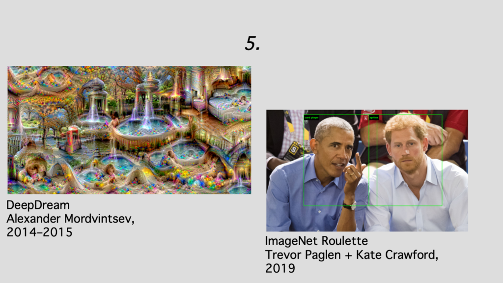 然后是特雷弗·帕格伦(Trevor Paglen)和凯特·克劳福德(Kate Crawford)的项目《ImageNet轮盘赌》(ImageNet Roulette),这是他们用来批判AI的项目之一。在系统的图像分类中,我挑选了一个相对温和的例子。基于已训练的ImageNet数据,美国总统奥巴马被识别为一个牌手,而英国王子哈里则被归类为狮身人面像。但事实情况比这个例子更严重,许多分类都公开地表达出种族主义和性别歧视的倾向,为了回应这一艺术项目,ImageNet做出了自我整改。