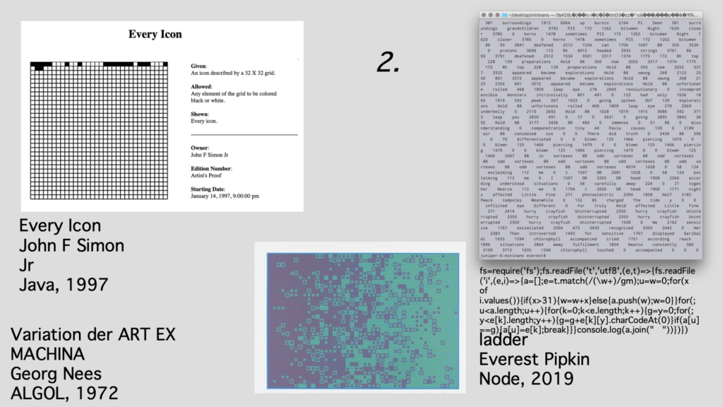 然后,我向大家展示的是埃弗勒斯·皮普金(Everest Pipkin)2019年创作的程序。它名叫《梯子》(ladder)。这个程序能于图像文件和文本文件之间进行转译,它能将图像转换为文本文件中的文字,并呈现在你眼前。这是这个程序的完整代码,它使用基于Node.js命令行环境的JavaScript编写而成。