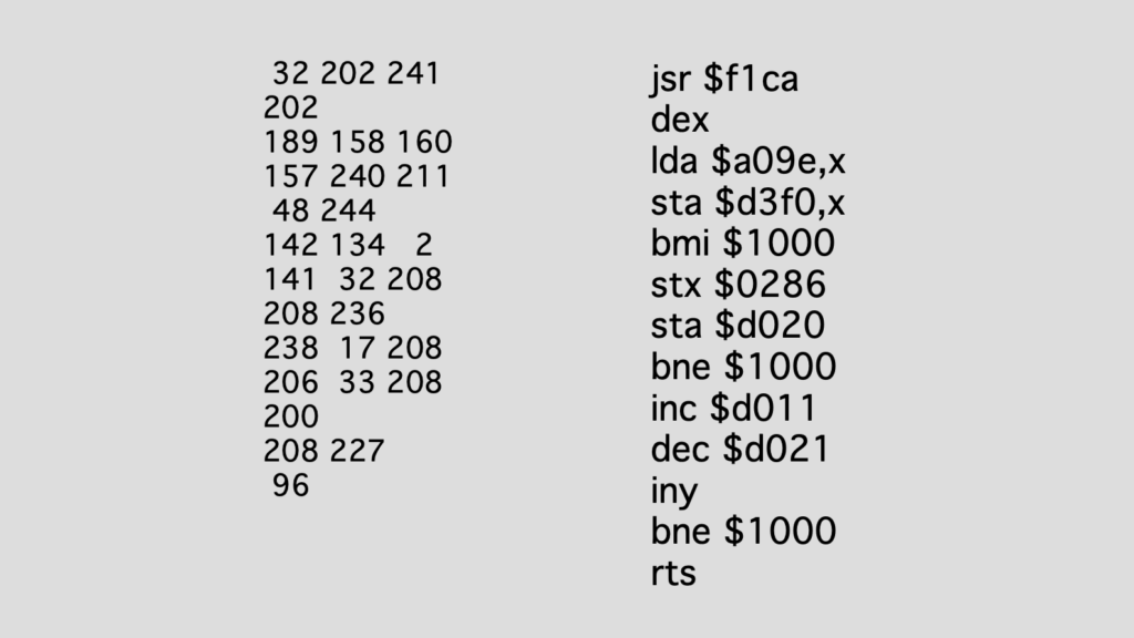 这是《时间量子》的全部代码,由汇编语言写就,仅占32字节。屏幕上呈现的,是它以十进制表示出来的样子。如果想通过Basic程序将其载入内存,可以直接调用这组十进制代码。整个视频的内容,都是由这段代码和康懋达64计算机构成的。当然,你需要实机才能运行它。这实际上是一个确定性的程序,当它运作时,每次结果都是相同的,看上去随机的效果,实际上都是一个特定内存区间提供的伪随机值。