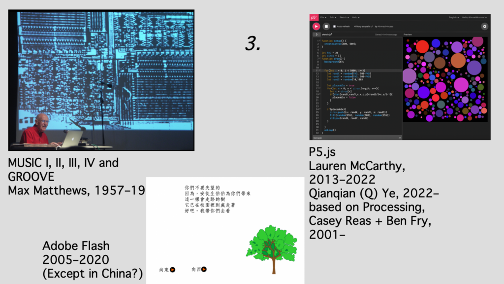 现在呈现的,是一件似乎已不再存在,或是西方国家中无人能找到的作品,它在Adobe Flash上运行,而对Flash技术的支持在2020年就结束了,据说中国的情况有所不同,但我对此不太了解。Adobe Flash本身也是一个有趣的例子,这个系统最初并非作为编程语言问世,而是以动画工具起步,后来才引入了ActionScript语言以供人们编程。我认为,与之相似的是,麦克斯·马修斯(Max Matthews)开发的Music Ⅰ、Ⅱ、Ⅲ、Ⅳ系列及Groove系统,一开始,它们是作为最初的合成器类应用被开发的,后来才演变成更通用的平台。因此,该系列作品和声音意义重大,1970年Groove面世,它成为供音乐家和计算机协同创作的系统。
