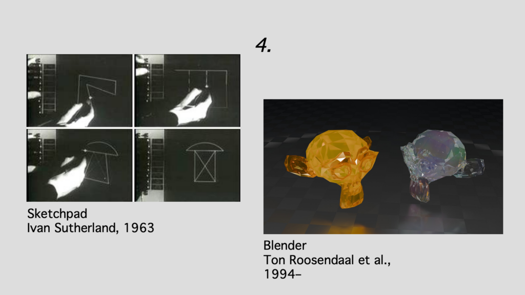 好的,让我们更进一步,开始讨论(面向艺术的)应用。大家都知道很多这类例子,比如Photoshop, GIMP, Illustrator, Inkscape, Final Cut Pro X, After Effects等等。但我还想强调Blender,这款软件最初诞生于名为NeoGeo的工作室(这个名字和同名的游戏主机毫无关联),自1994年起步,如今已成为3D建模的重要工具,更是一个自由开源的软件系统。