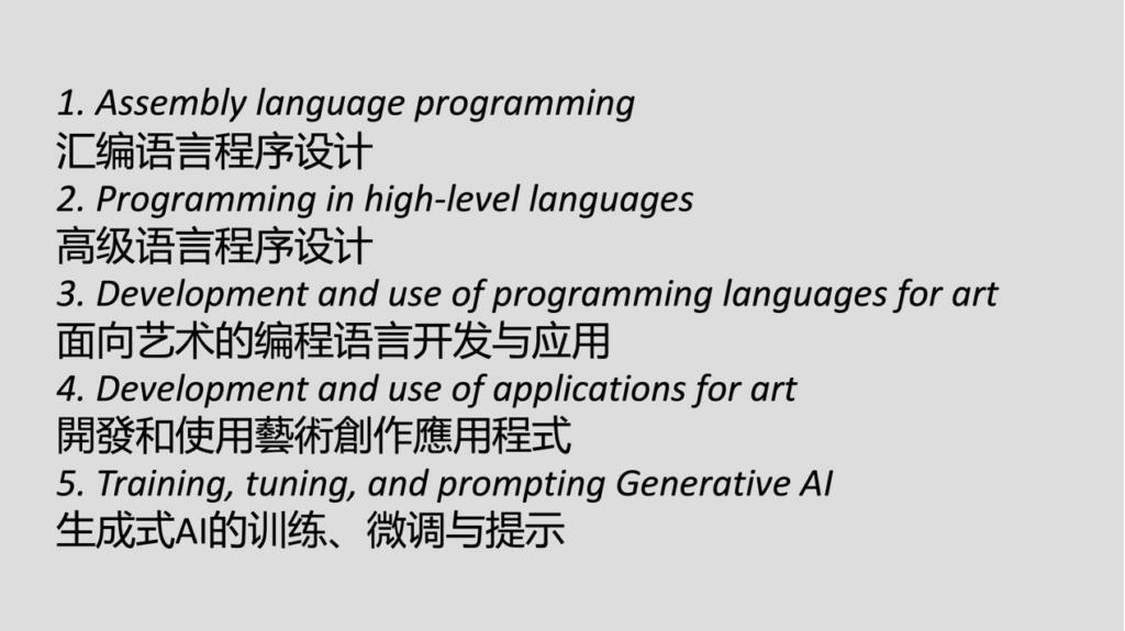 接下来我将快速举例说明,这五种创作模式是如何应用于文学之外的艺术领域的。还是从汇编语言编程谈起,接着是通用高级语言编程,再到面向艺术的编程语言的开发与使用、艺术类应用程序的开发与使用,最后是生成式人工智能。