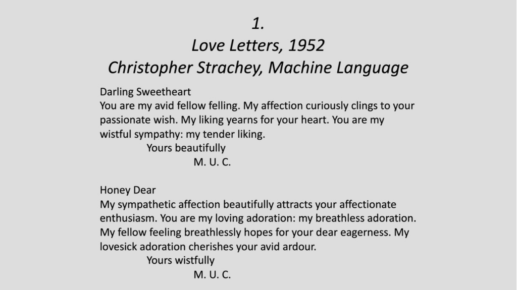 让我们从文学艺术谈起,它跟我的实践和研究关系最为密切。这是1952年克里斯托弗·斯特雷奇(Christopher Strachey)在曼彻斯特大学制作的电脑程序——《情书》(Love letters),系统输出了如下文字:
