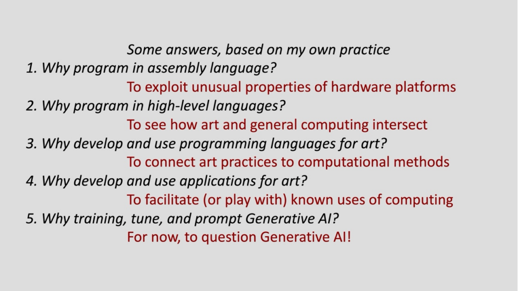 因此,我想探讨这五个核心问题:人们为何要从事这五类创作?为何有人用汇编语言编程,为何使用高级语言进行创作,为何应用和开发面向艺术的编程语言,为何开发和使用艺术类应用程序,以及为何使用生成式AI进行创作。我无法代表所有人回答这个问题,毕竟自己只是单个身在其中的艺术家而已。我既非民族志学者,也不是电影制作人,不像迪伦(Dylan Reibling)那样进行过访谈。但我可以分享自己的见解。