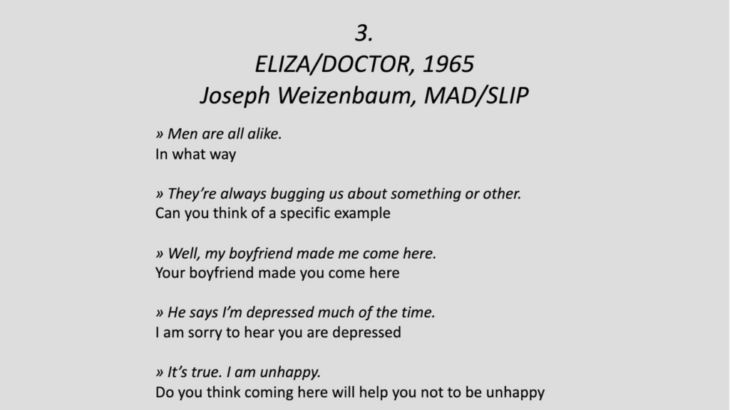 现在我提到的,是一个非常著名的文本生成器范例——约瑟夫·维森鲍姆(Joseph Weissenbaum)1965年开发的聊天机器人ELIZA/DOCTOR。之所以谈及它,不只因为它是首个聊天机器人,是ChatGPT的前身,还因为它是一个平台,一种能创造不同虚拟角色的方式。因此,Eliza是一个系统框架,既能运行“DOCTOR”脚本,也能兼容其他角色脚本。