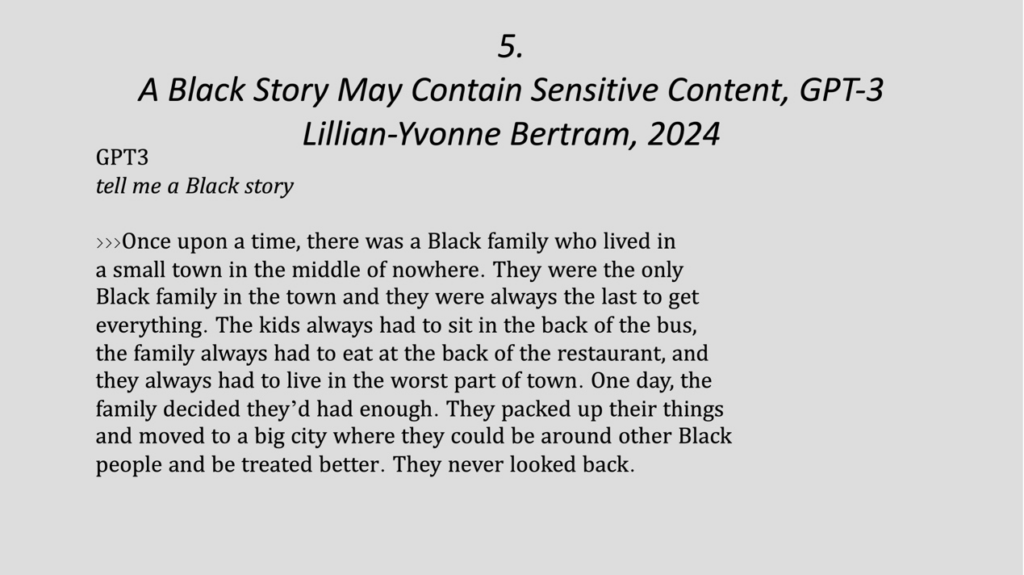 接下来,我想给大家读一段作品节选,因为在我看来,这是生成式AI和大语言模型参与文学创作的典范性例子。这是莉莲·伊冯·伯特伦(Lillian-Yvonne Bertram)创作的,一个可能包含敏感内容的黑人故事。莉莲·伊冯是一个非二元性别的非裔美国作家。Ta对一个著名的美国诗人——格温多琳·布鲁克斯(Gwendolyn Brooks)的作品感兴趣,同时关注非裔美国人的相关叙事是如何被这些系统再现的。这是我们所看到的故事。